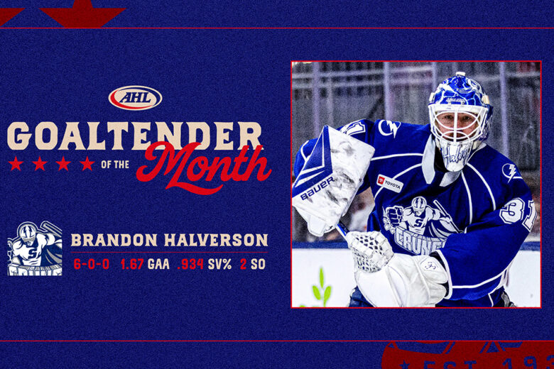 Brandon Halverson of the Syracuse Crunch has been selected as the AHL Goaltender of the Month for February.