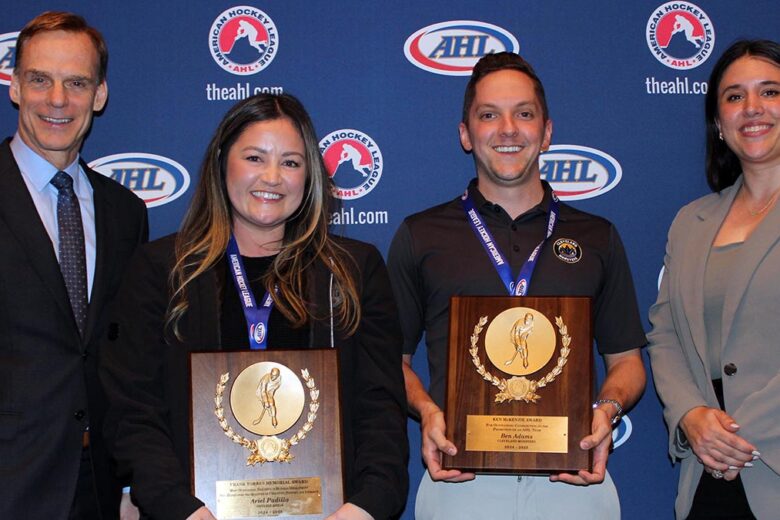 The American Hockey League honored Ben Adams of the Cleveland Monsters and Ariel Padilla of the Ontario Reign at the 2025 AHL Team Business Meetings in Indianapolis.