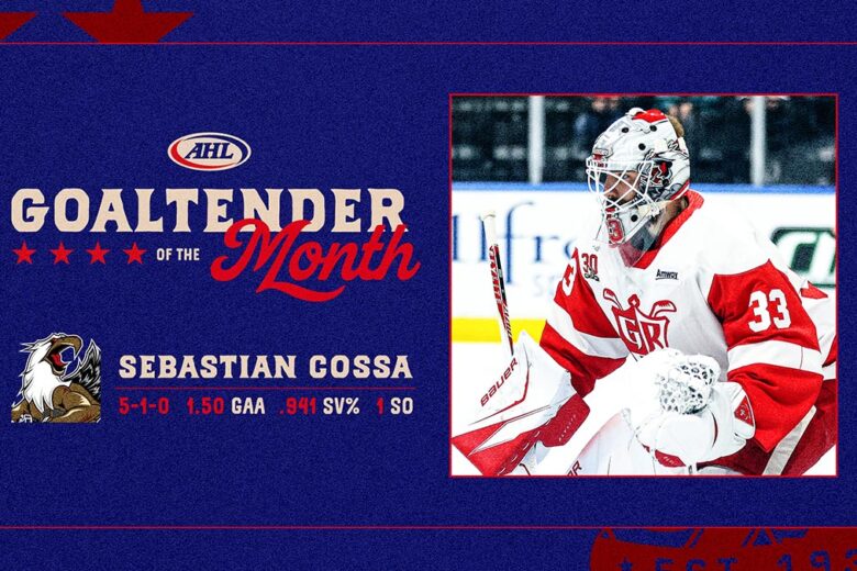Sebastian Cossa of the Grand Rapids Griffins has been selected as the AHL Goaltender of the Month for November.