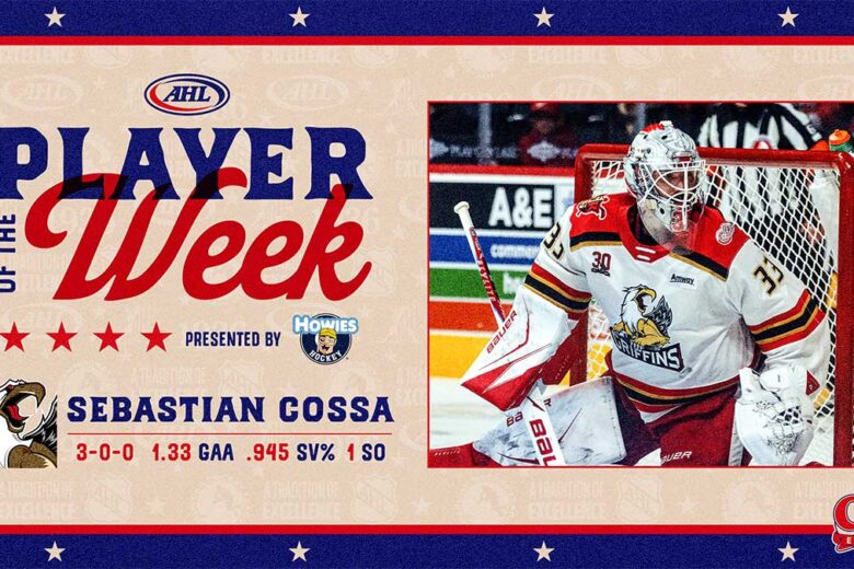 Grand Rapids Griffins goaltender Sebastian Cossa has been selected as the Howies Hockey Tape/AHL Player of the Week for the period ending November 30, 2025.